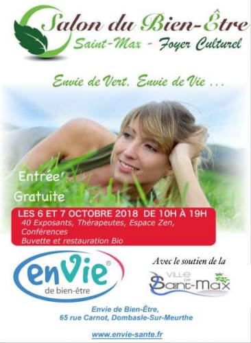 Envie de bien-être organise la 7ème édition du Salon BIO et Bien-Être, cette année à ST MAX, les 6 et 7 octobre 2018 au foyer culturel, de 10h à 19h.
