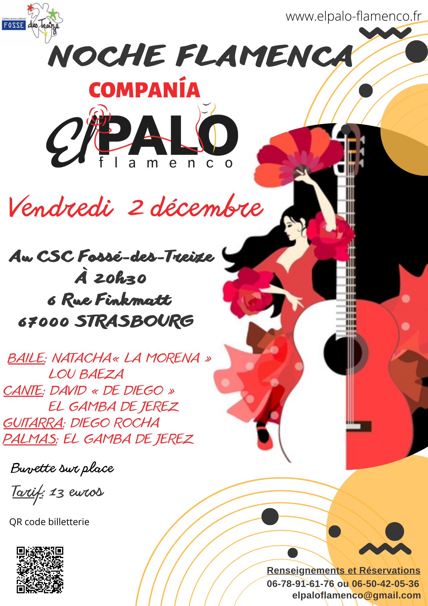 La compagnie El Palo Flamenco est heureuse de vous présenter son spectacle "Noche Flamenca" le vendredi 2 décembre 2022 à 20h30              au CSC Fossé-des-Treize                                          6 rue Finkmatt  67000 Strasbourg ????