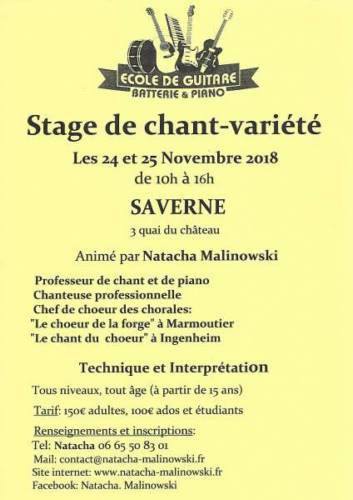 Ce stage aura lieu à Saverne, les 24 et 25 Novembre à l’école de guitares de Jérémie Maennlein où j’enseigne le chant et le piano. Le lieu, 3 quai du château est idéal pour un stage de chant, on s’y sent tout de suite dans le vif du sujet car les murs respirent la musique, et la vue sur le canal est très inspirante! Ce stage, à l’image de l’école dans les styles pop-rock-jazz-blues, est particulièrement recommandé aux chanteurs (euses) de tous ces styles, à partir de 15 ans. Vous y trouverez toutes les solutions pour chanter votre musique préférée en apprenant la respiration abdominale, en travaillant votre articulation, en prenant conscience de votre corps comme instrument de la voix, et surtout, comment éviter la fatigue vocale. N’hésitez pas à m’appelez pour plus de renseignements, au 06 65 50 83 01.
