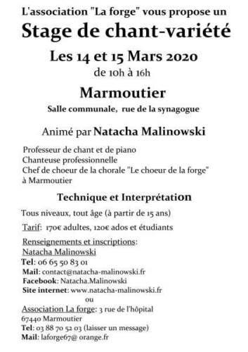 Je vous propose donc un stage de mise ou remise en forme vocale les 14 et 15 Mars 2020 à la salle communale de Marmoutier (voir affiche) de 10h à 16h.