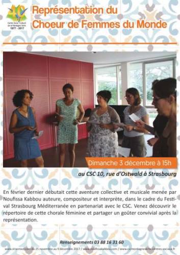 Dans le cadre du Festival Strasbourg Méditerranée 2017 et en partenariat avec le CSC Montage Verte, le chœur de femmes "une Terre et des Couleurs" dirigé par la chanteuse Noufissa Kabbou donne sa première représentation.