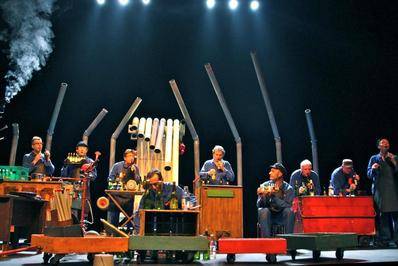 Zic Zazou, c’est neuf musiciens-comédiens-chanteurs qui jouent de multiples instruments parfois incongrus. De la fanfare recyclée punk au rock mâtiné de musette et de funk, ils mélangent tout, en gardant la substantifique vitalité. Ils sont aussi à l’aise à la guitare électrique, au piano, au trombone qu’aux pieds de chaise, aux marteaux ou aux bouteilles. Ils composent leur musique, la jouent et explorent les mille et une possibilités mélodiques et rythmiques des objets qu’ils fabriquent, recyclent ou détournent pour nous offrir un gigantesque poème musical. C’est ingénieux, ludique, poétique, les initiés apprécieront la performance et les autres se laisseront porter par la magie de la représentation.